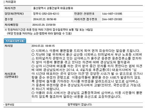| 울산시외버스터미널과 푸른교통은 하루빨리 울산시와 협의된 경상남도의 지시사항인 웅촌정류소를 신설?이행하여 운행하여 주시기 바랍니다. 울산-부산(동래)간 시외심야버스 웅촌정류소 폐쇄의 건 울산시외버스 터미널에서 운행되고 있는 “푸른교통 울산-부산간 심야버스”를 자주 이용하고 있는 울산시민입니다. 이렇게 민원을 재기함은 심야버스 운행에 관한 정류소와 그에 관한 요금의 문제를 제기하오니 울산광역시 교통정책 관련 부서에서는 하루빨리 신속한 해결로 시민의 불편과 과대요금을 지불하는 일이 없도록 해 주시기 바랍니다. 울산시외버스 터미널에서는 울산터미널-부산동부터미널(동래)까지 05:40~22:00까지는 일반시간으로 운행을 하고, 22:15~02:00까지는 심야버스로 운행을 하는데, 심야버스의 운행에는 일반 시간대에 운영하고 있던, 웅촌정류소를 폐쇄하고 운행을 하고 있어 웅촌면민은 심야버스이용에 불편과 과다요금을 지불하고 있습니다. 양산시소재 푸른교통은 울산시외버스터미널-공업탑정류소-법원정류소-관문정류소-웅촌정류소-서창정류소-덕계정류소-동부시외버스터미널 로 운행하던 노선이 왜 심야에는 웅촌정류소를 폐쇄하고 운행을 하는지는 알수가 없으나, 웅촌면도 울산광역시 내에 속해있는 한 면소재지로서 오랜 역사를 가지고 있으면서도, 울산의 회야댐보전유지 정책에 의해 발전이 저해되어 있는 것만도 억울한데, 발전저해로 낙후성을 면치 못하다 보니, “울산터미널측과, 푸른교통담당자의 말에 의하면 적은 이용객으로 인해 웅촌정류소를 폐쇄하는데 울산시와 협의하여 웅촌정류소를 빼고 인가노선을 허가받았다는 답변을 듣고 더욱더 울산시가 원망스럽습니다.” 웅촌면민을 무시하고 웅촌면민을 말살하는 울산시의 정책을 언제까지 계속 하실련지요? 지금현재 울산-웅촌간의 요금이 2,200원 이니 이에 걸맞는 요금인 심야할증10%추가인 2,420원의 요금을 지불하고, 정상적으로 웅촌으로 매표를 해서 웅촌정류소에 정차하여야 함에도, 웅촌정류소를 폐쇄함으로 인해 서창(일반3,000원, 심야3,300원)3,300원의 요금을 내고 서창표를 매표하여 운행기사님께 구걸을 하여 웅촌정류소에 하차를 하고 있는 실정입니다. 울산시에서는 이를 하루빨리 파악하고 시정하여서, 웅촌면민도 정상적인 웅촌표를 매표하여, 뜨뜻하게 하차하고, 쓸데없이 서창요금을 지불하는 과다요금이 시정될 수 있도록 민원을 재기하오니, 빠른 시정으로 웅촌면민의 불편함을 최소화 해 주시기 바랍니다. -끝- 2014년 3월 17일 운촌면 민원인 000 참고: http://blog.naver.com/bch4518/220069527615 ![]() ![]() ![]() ![]() ![]() ![]() ![]() ![]() ![]() ![]() | |||