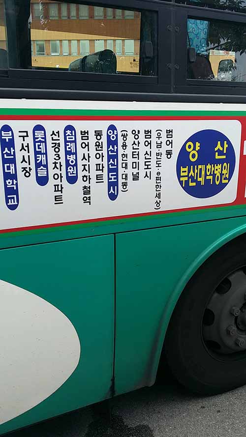 벌써 여기소속 노선에서만 행선판 오류차량을 3번정도 봤어요. 노선 정보는 안뜨고 Active Yangsan만 뜨는 현상이요. 어제 아침 9시 22분쯤에 양산역을 지난 8332호차 88번 노선에서 발생했습니다. 이 현상은 노선정보가 표출되지 않는 것이라 다소 심각한 문제라고 생각되요. 전체 노선 LED 행선판을 점검하여 하루 빨리 이 문제가 해결되길 바랍니다. 그리고 16번이랑 16-1번 측면 행선판에 경유지에 `범어동`이라고 적혀있네요. 범어동이라는 행정구역은 없어요. 물금읍 범어리이지요. 범어동이 아닌 범어리, 또는 범어라고 수정표기하는 것이 맞지 않을까요? 버스정보시스템에도 대학병원방면 노선의 목적지(종점)표기가 범어동으로 되어있는데 이 부분도 범어행으로 수정되길 바랍니다. 그리고 지하철역이라는 명칭보단 ~~역, 또는 도시철도역이 맞다고 봐요. 이젠 실제로 역에가도 그렇고 열차를 이용하면 지하철이라는 명칭은 공식적인 명칭에서 도시철도로 변경되었습니다. 아직까진 지하철이라는 말이 친숙하긴 하지만, 명칭이 변경된 만큼 도시철도라는 명칭을 사용하면 좋을 듯 해요. 이에 버스노선과 행선판에 표기된 지하철 명칭도 도시철도로 바꾸거나 또는 간단하게 ~~역으로 바꾸는게 좋을 것 같습니다.