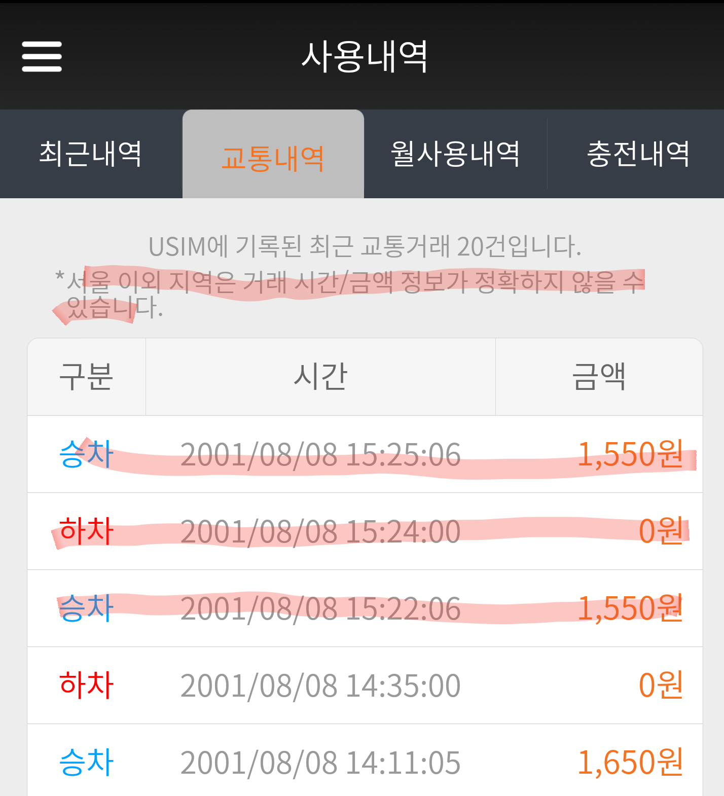 저번에 태광산업(구서역)에서 범어사 방향으로 가는 12번 버스를 탔습니다 제가 들고다니는 교통카드 모바일 티머니인데, 카드 찍는데 찍었는데 버스요금은 나갔는데 잔액이 부족하다고 나와서 기사님한테 버스요금이 찍혔다고 돈 나간것까지 보여드렸는데 안냈다며 다시찍으라했습니다 기사님 말씀대로 다시 찍어보니 기계에서는` 하차입니다`가 나왔습니다. 그럼 저는 요금을 찍었는데도 불구하고 기사님 말씀대로 한번 더 찍어서 돈이 이중으로 나가게 되었습니다 저번에도 이런일이 있어서 저번에도 이중차비 들어었는데 확인부탁드립니다. 첨부파일이 2017년도꺼인데, 서울 이외지역은 시간이잘나오지않는다고 하니 양해부탁드립니다.
